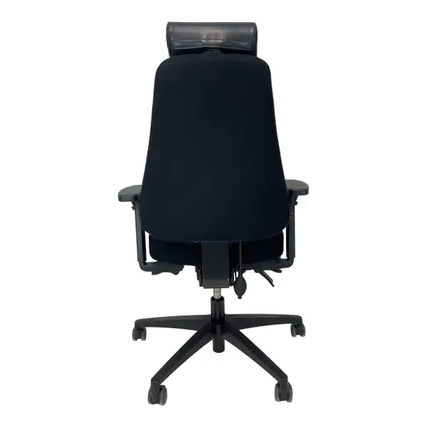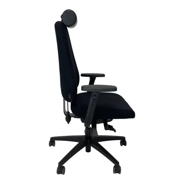 Arbetsstol från Lanab Design ink. nackstöd & armstöd. Stolen är helklädd i ett svart tyg & ett nackstöd i svart skinn.