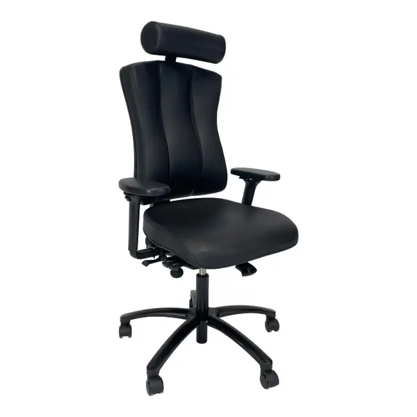 Arbetsstol Höganäs +502 helklädd i svart läder. ink. nackstöd, armstöd & svankpumpsstöd.