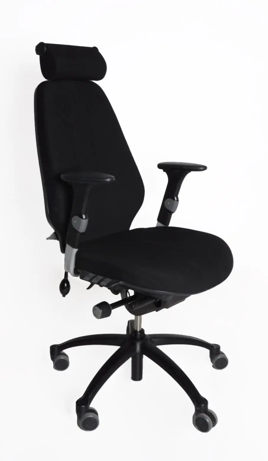 RH Logic 400 är en populär stolserie tack vare ergonomin, komforten och den långa livslängden. Stolen anpassas enkelt efter individuella behov. En stol att sitta skönt i länge. RH Logic 400 är i standardutförande utrustad med luftreglerat svankstöd och fotkryss i aluminium. Reglagen är enkla att komma åt för att ställa in eller ställa om efter dina behov. Ryggvinkeln kan justeras separat medan stolen behåller alla dina inställningar även när du använder gungan. Denna arbetsstol är omklädd i ett helt nytt svart tyg.