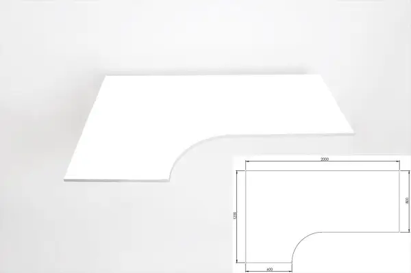 Skrivbordsskiva i vitt laminat. Denna modell kallas kombiskiva och är svängd för att kunna ge mer arbetsyta. Bilden visar en vänstersvängd skiva, men givetvis kan svängen likaväl ligga åt höger. Kompletteras med passande underrede.