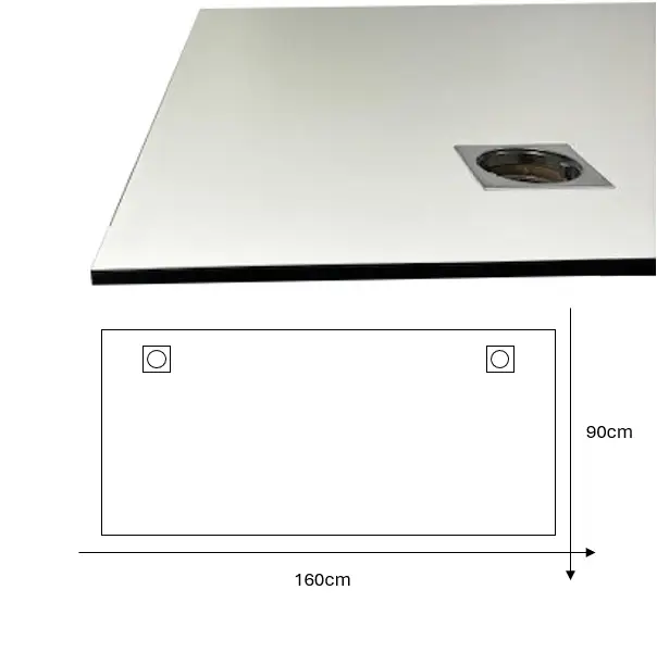 Bordsskiva i vitt med svart fasad kant, utrustad med 2st kabelhål inklusive silvriga täcklock för hålen.